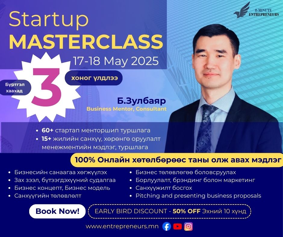 Өөрийн бизнесээ мөрөөдсөөр л байна уу? Startup MASTERCLASS хөтөлбөрийн бүртгэл дуусахад 2 хоног үлдлээMay 11, 2025